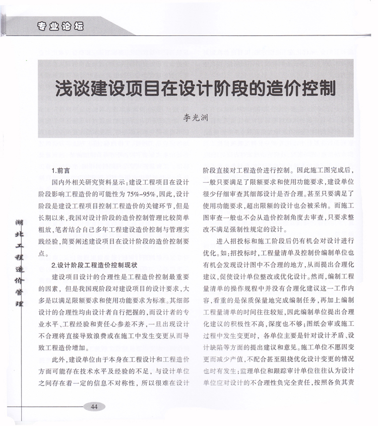 我司李光洲同志論文《淺談建設項目在設計階段的造價控制》發(fā)表