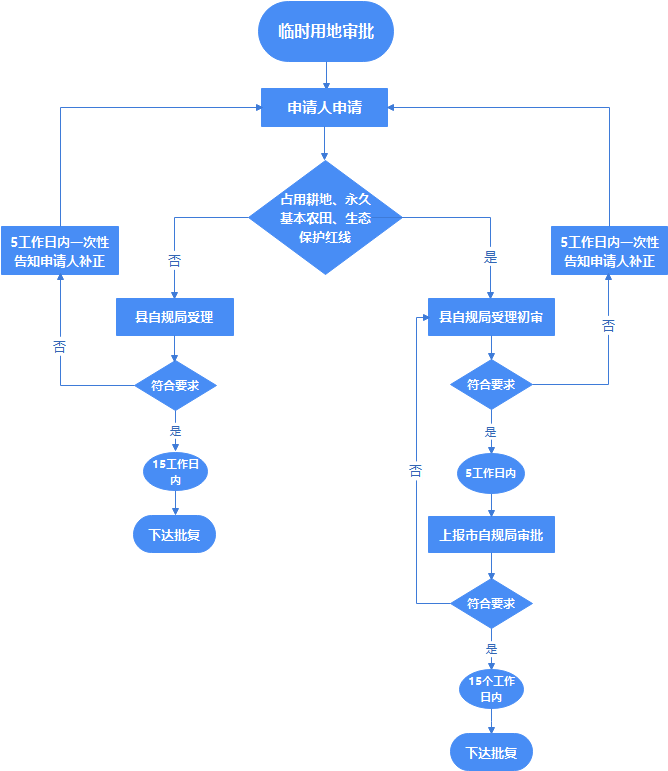 1、申請人向臨時用地所在地的縣(市、區(qū))自然資源主管部門提出申請,由縣(市、區(qū))自然資源主管部門負(fù)責(zé)辦理臨時用地審批。