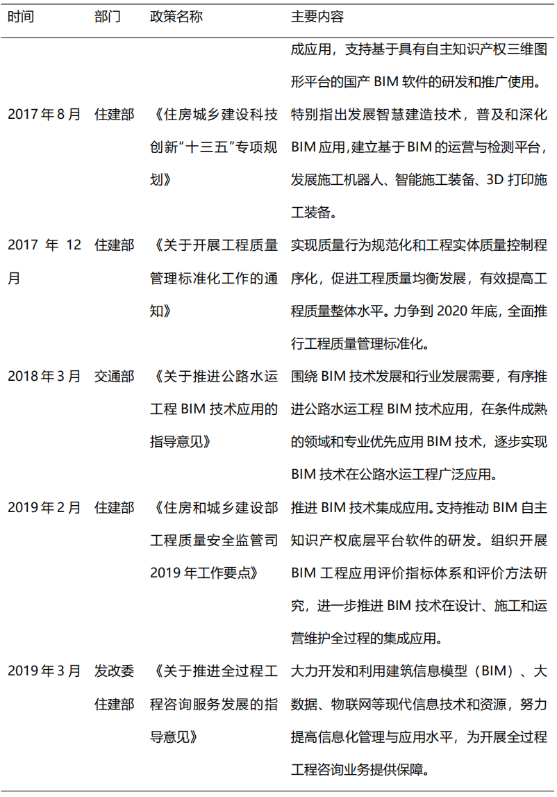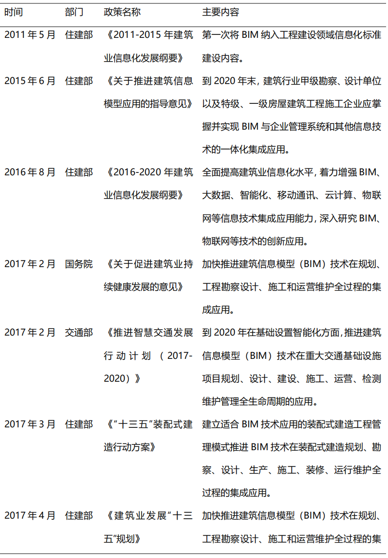 隨著社會的發展,行業需求的轉變,加之國家和各地政府的扶持,建筑行業信息化、數據化、智能化趨勢不可逆轉。BIM勢必全面應用到規劃、勘察、設計、施工和運營維護中來,實現工程建設項目全生命周期數據共享和信息化管理。近年來,國務院、住建部等相關單位,頻繁頒發鼓勵和要求應用BIM技術的指導意見,表1列出了國家層面的重要文件