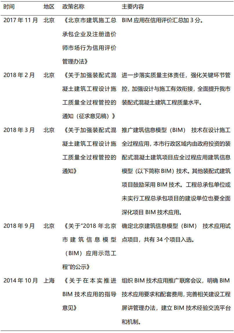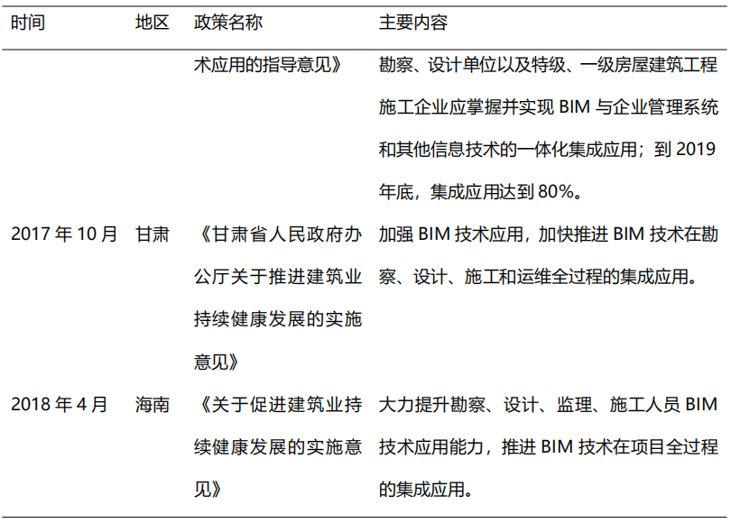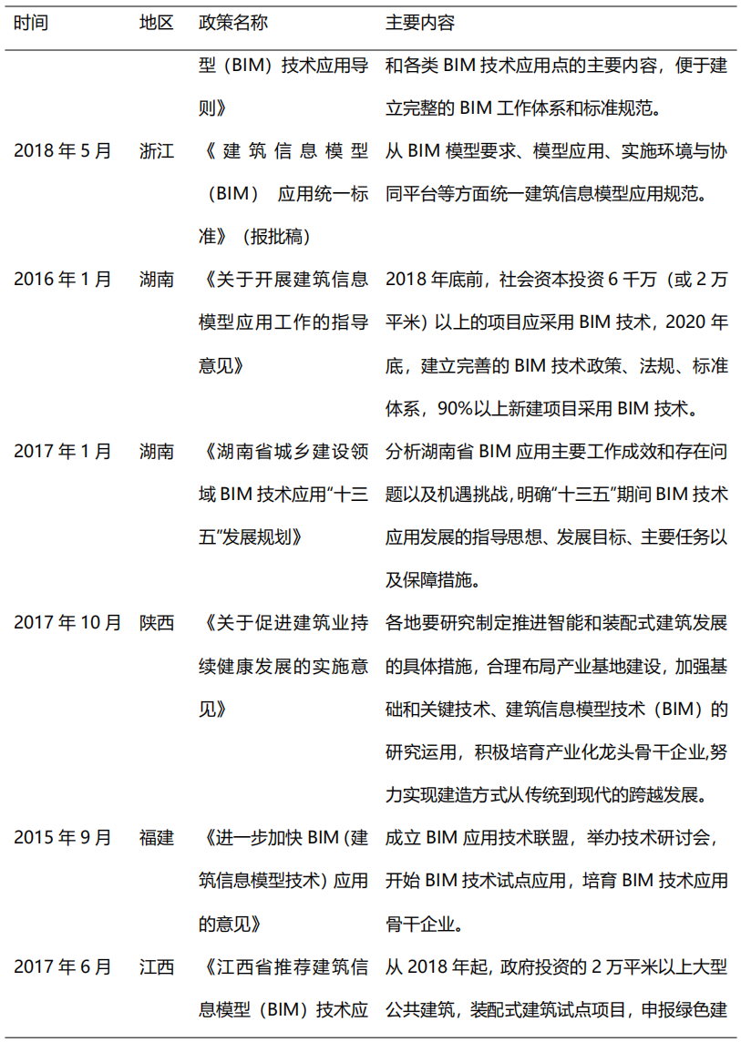 從2014年開始,在住建部的大力推動下,各省市政策相繼出臺BIM推廣應用文件,到目前我國已初步形成BIM技術應用標準和政策體系,為BIM的快速發展奠定了堅實的基礎。2017年,貴州、江西、河南等省市正式出臺BIM推廣意見,明確提出在省級范圍內提出推廣BIM技術應用。2018-2019年,各地政府對于BIM技術的重視程度不減,重慶、北京、吉林、深圳等多地政策出臺指導意見,旨在推動BIM技術進一步應用普及。隨著我國出臺BIM推廣意見的省市數量逐漸增多,全國BIM技術應用推廣的范圍更加廣泛。表2列舉了部分重要地方鼓勵政策。