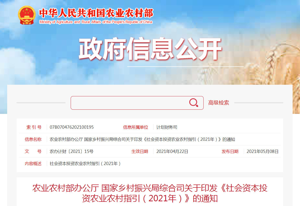社會資本投資農業農村指引(2021年)發布,涉及13個重點產業和領域!