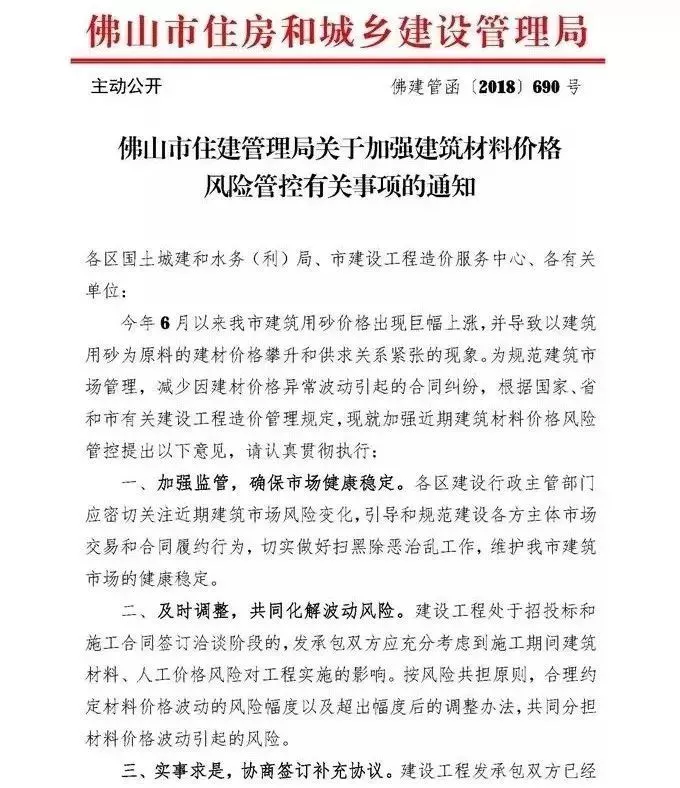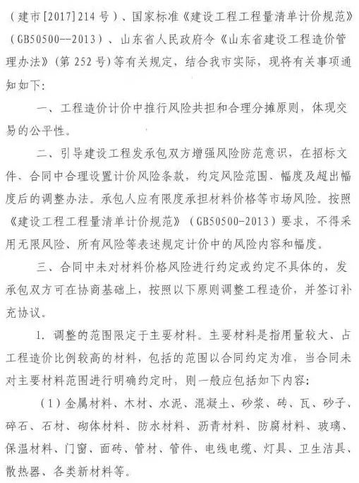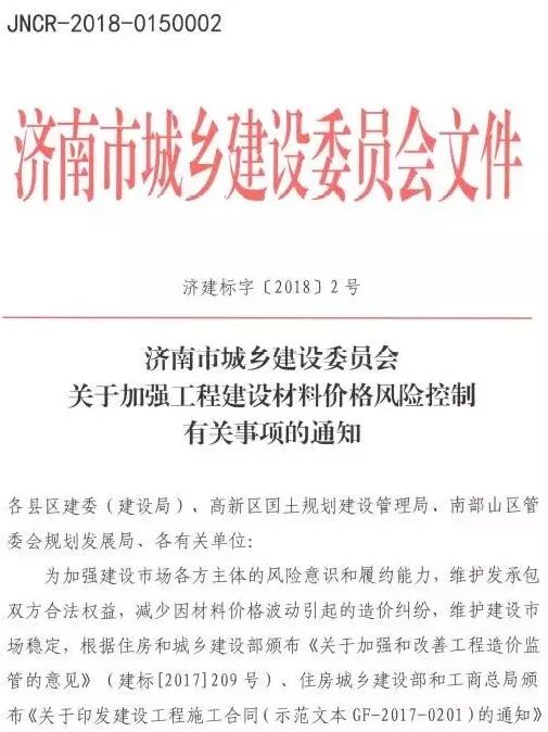 2018年1月30日,濟南市住建委印發《關于加強工程建設材料價格風險控制有關事項的通知》(濟建標字〔2018〕2號),明確工程計價中應推行風險共擔和合理分攤原則,承包人應有限度承擔材料價格等市場風險。