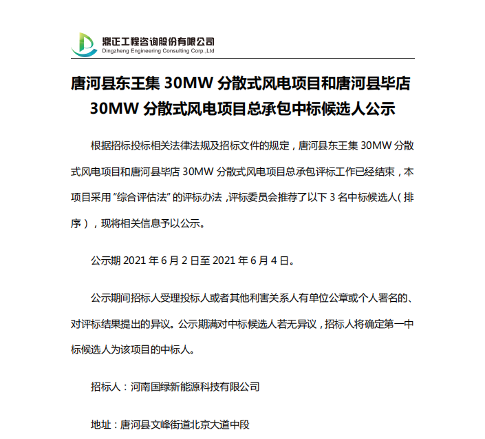 唐河縣東王集30MW分散式風電項目和唐河縣畢店30MW分散式風電項目總承包中標候選人公示