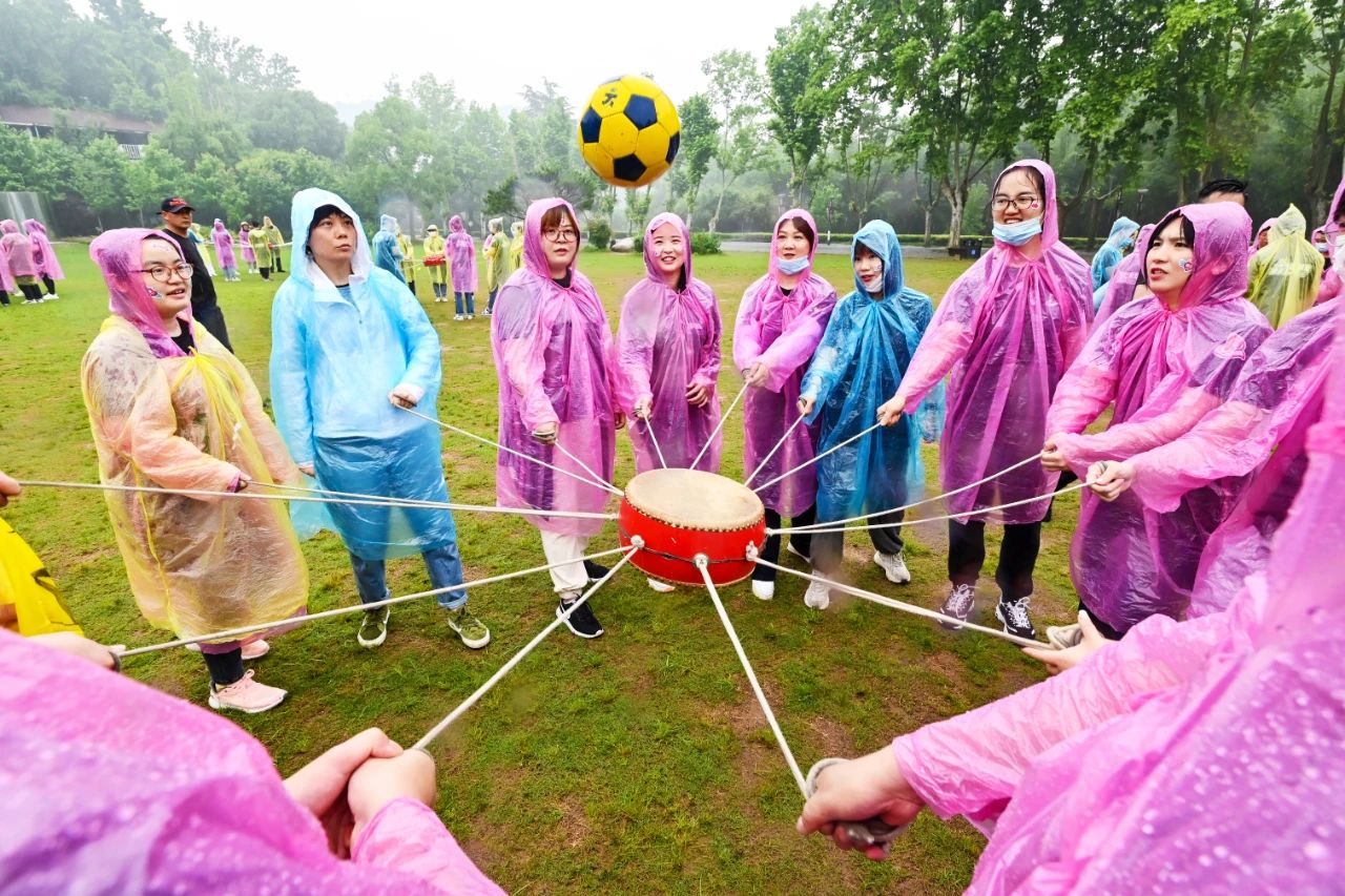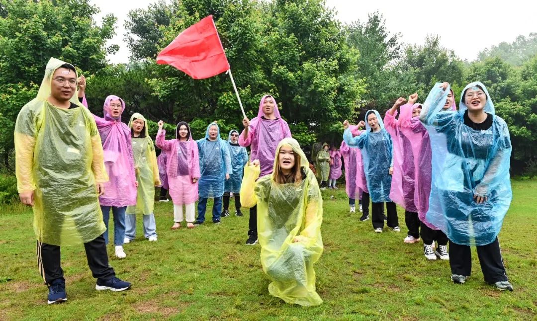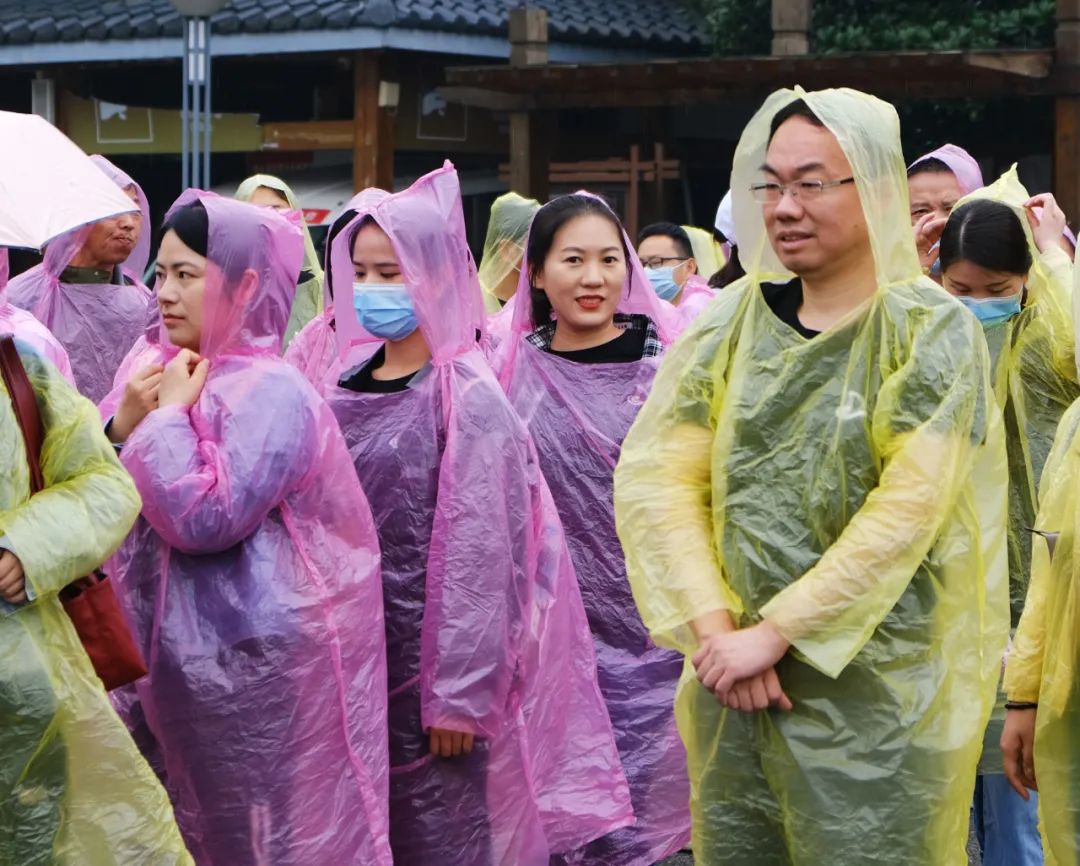 活動當天雖當天上午持續陰雨連綿,但是出游的同事們并未停下腳步,路途大巴上交談甚歡載歌載舞,欣喜之情溢于言表,穿上花花綠綠的雨衣在雨霧中穿行,在東湖磨山水墨畫一般的景色中劃出一條彩色的長線,亦是一道別樣的風景。