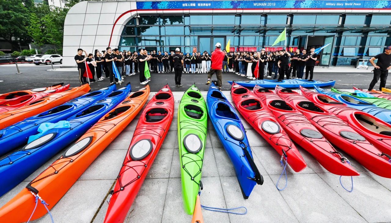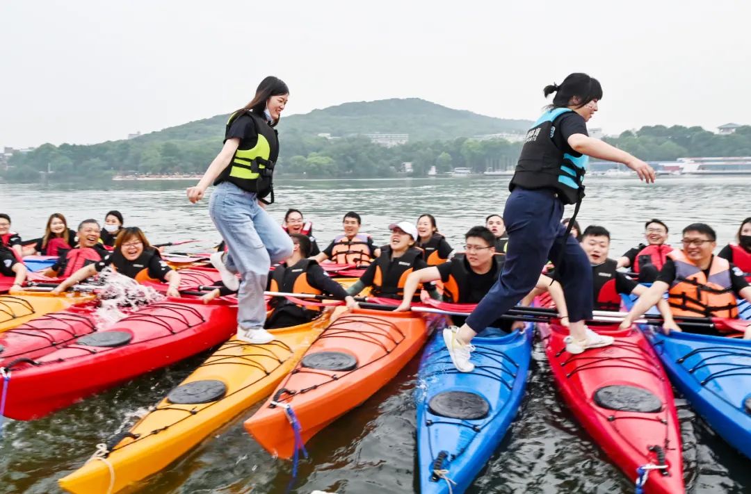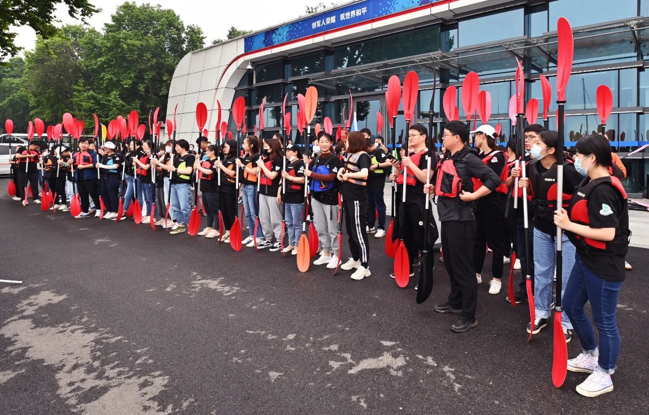 接下來是皮劃艇環節,五顏六色的皮劃艇整齊的排列在地上,小伙伴們早已迫不及待的穿上了救生衣,拿起了船槳,整齊的方陣蠢蠢欲動,頗有“百萬雄師過大江”的氣勢。