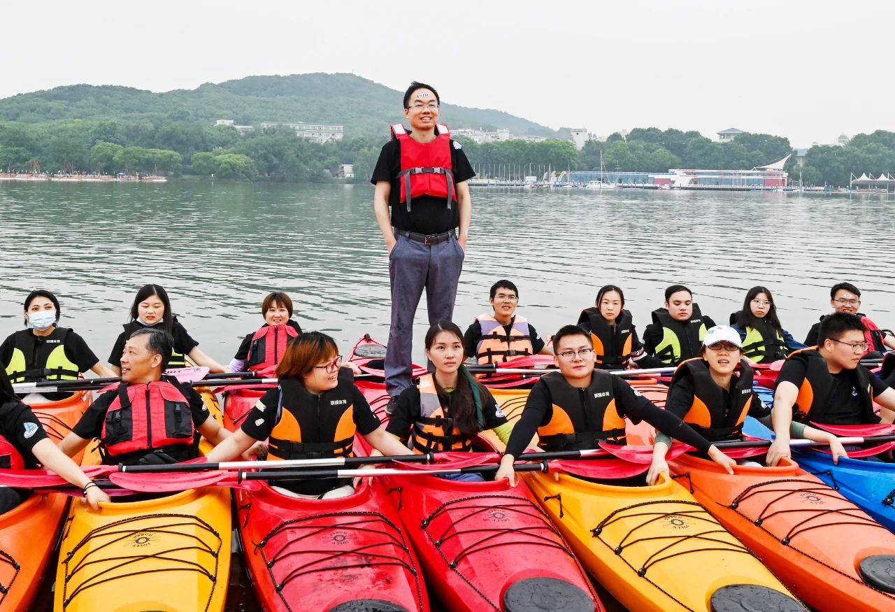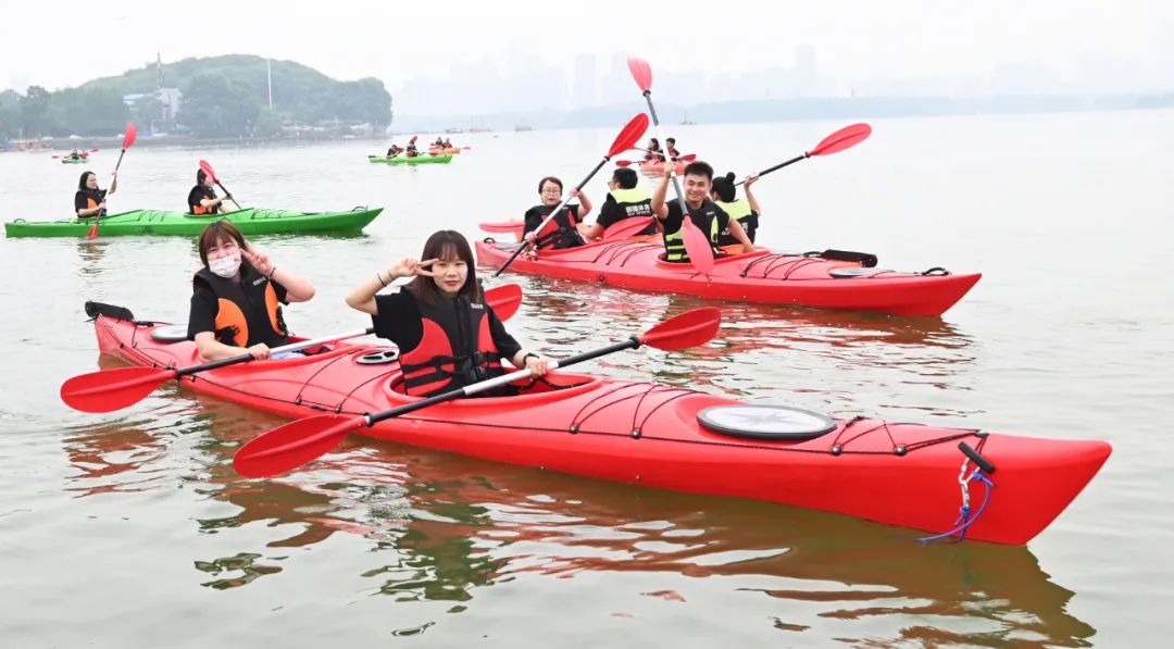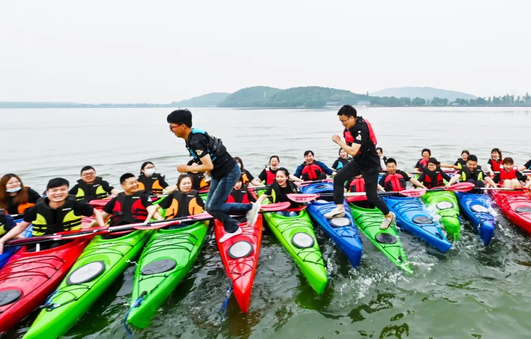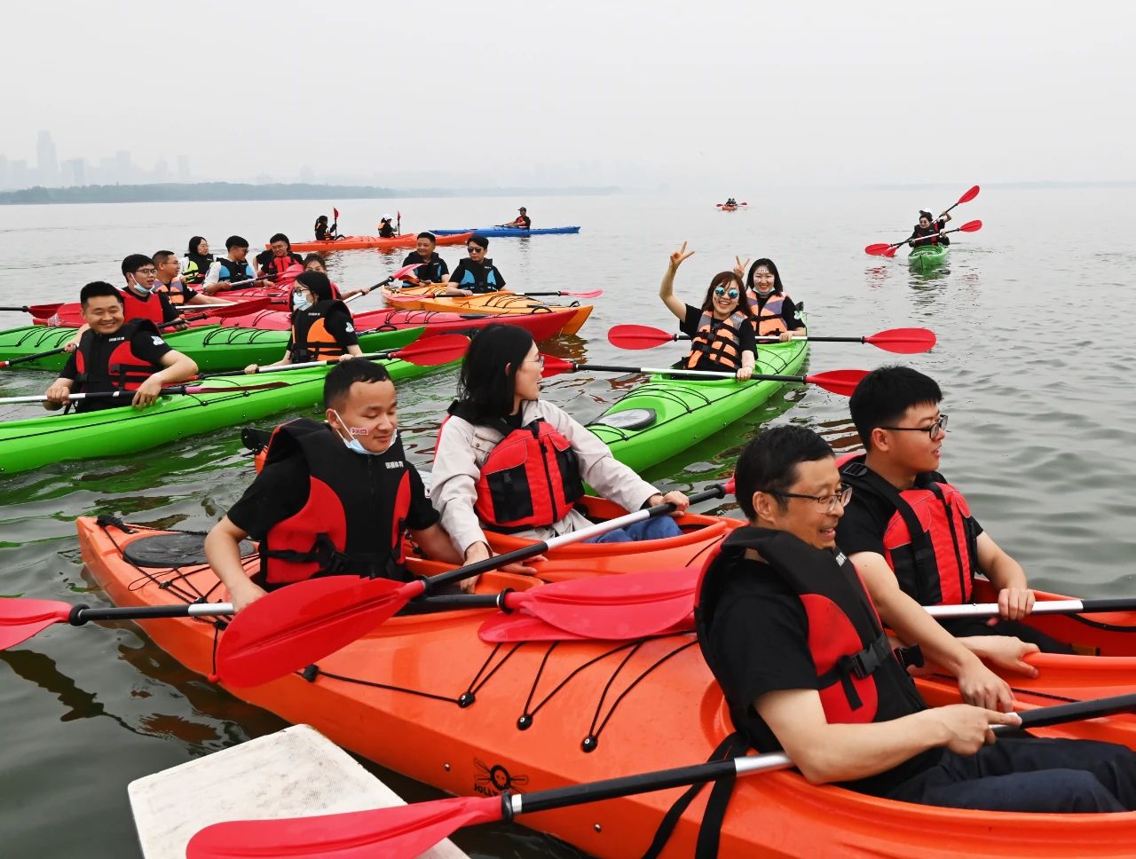 接下來是皮劃艇環節,五顏六色的皮劃艇整齊的排列在地上,小伙伴們早已迫不及待的穿上了救生衣,拿起了船槳,整齊的方陣蠢蠢欲動,頗有“百萬雄師過大江”的氣勢。