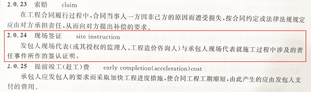 依據《建設工程工程量清單計價規范》(GB50500-2013)第2.0.24條對現場簽證的定義:“發包人現場代表與承包人現場代表就施工過程中涉及的責任事件所作的簽認證明。”