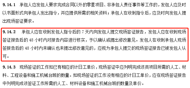 此外,第9.14.2條中,“......發包人在收到承包人現場簽報告后的48小時內未確認也未提出修改意見的,應視為承包人提交的現場簽證報告已被發包人認可。”即,從時限來講,“48小時”亦非能夠滿足發包方充分詢價并與承包方定價的時長。