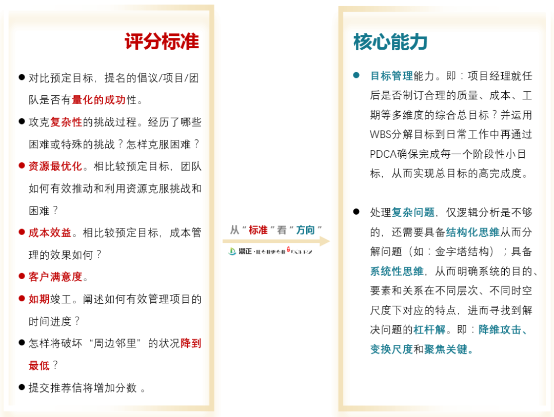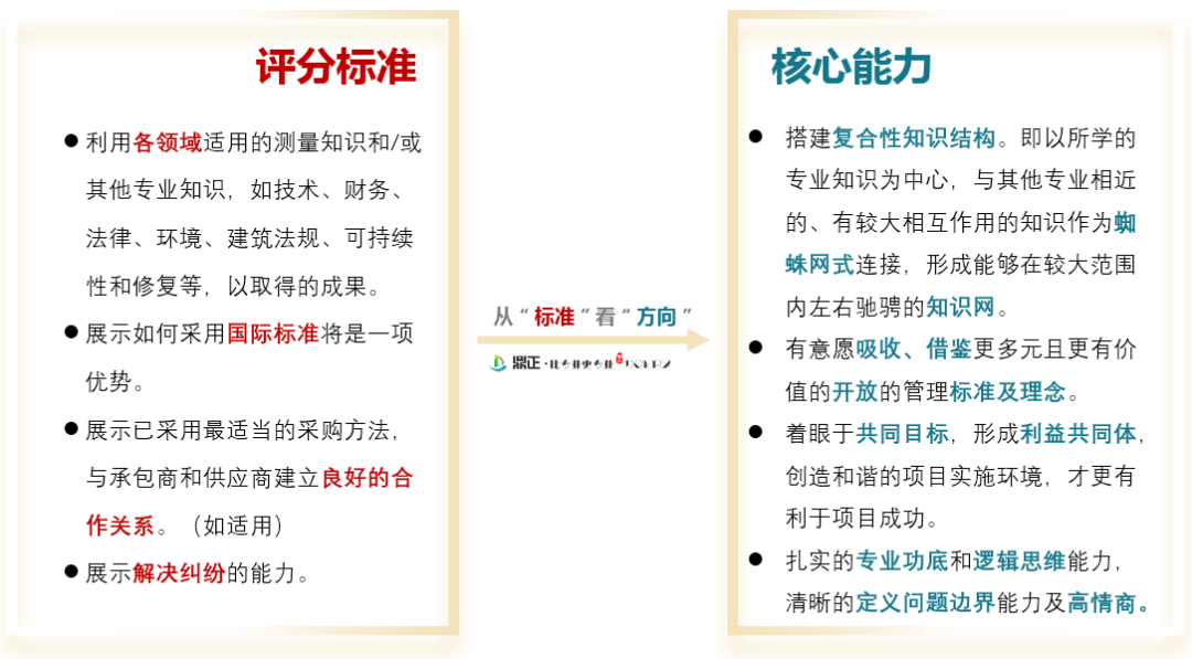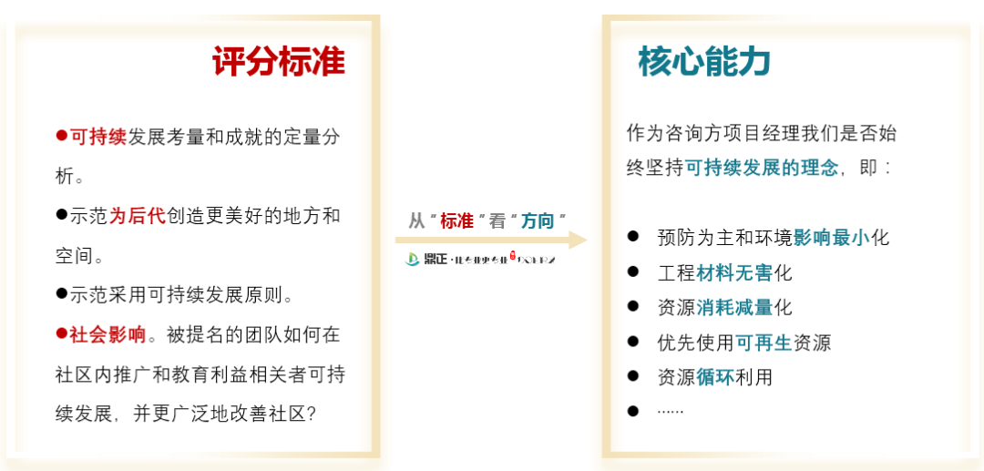通過此次評獎申報過程中的思考與體會,我們想從RICS中國獎評分標準談談項目經(jīng)理的努力方向。無論是投資決策咨詢、規(guī)劃設計,還是政府采購與招標代理、工程造價咨詢、工程監(jiān)理及項目管理咨詢的項目經(jīng)理,都需要明確?優(yōu)秀的項目管理是什么樣的?要實現(xiàn)這些成果需要培養(yǎng)并精進哪些核心能力?