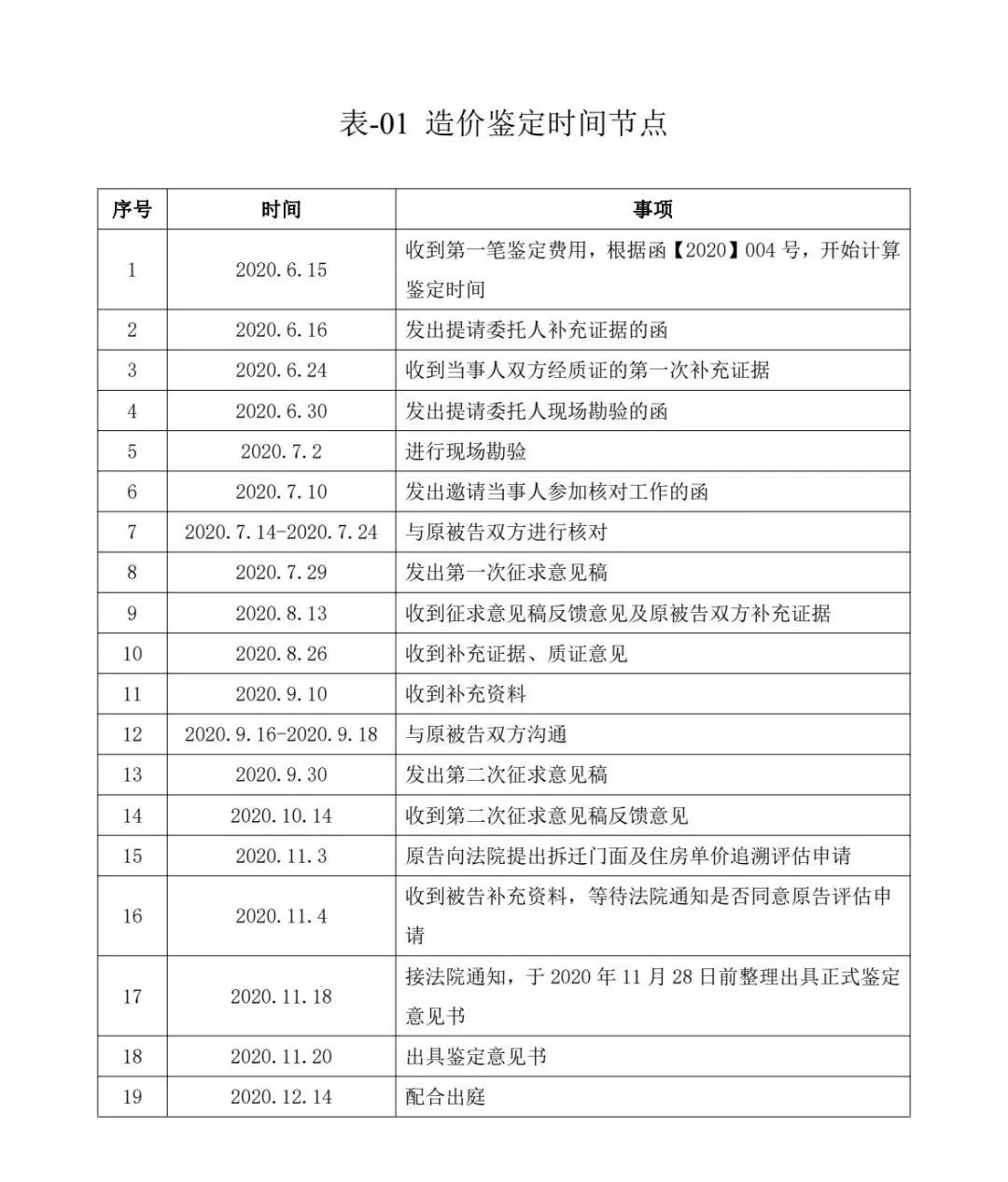 案例項目的造價鑒定中,時間節點詳表-01。