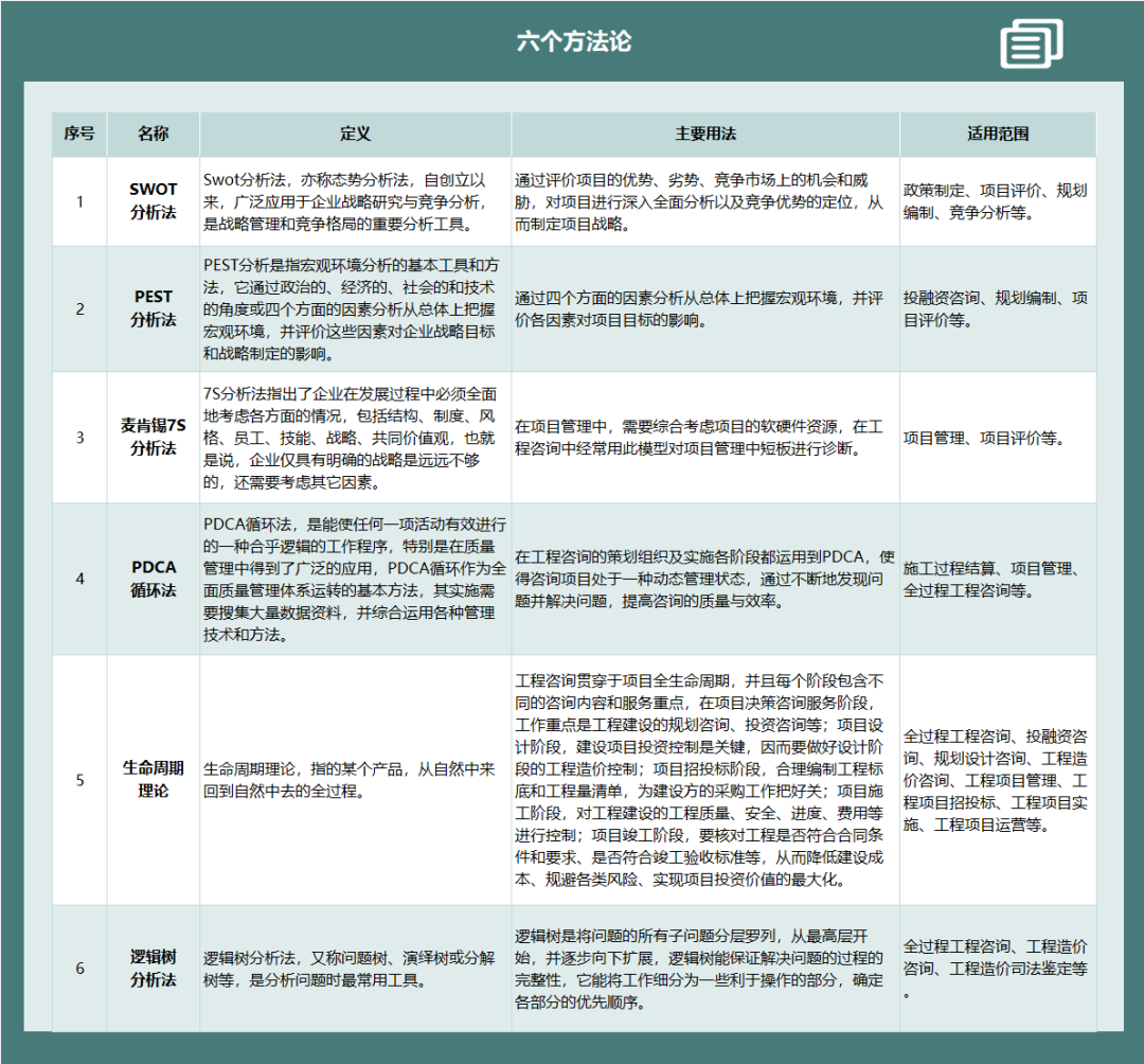 在理念更新迭代以后,行動必須緊緊跟上。王志綱老師曾說:“我手中掌握的超級法寶,就是方法論。只有掌握了正確的方法論,才能做到海納百川,消化一切?!?因此,作為一家工程咨詢服務(wù)機構(gòu),工作方法論便是幫助我們更好地診斷、研判、分析、實操項目的獨門秘方。