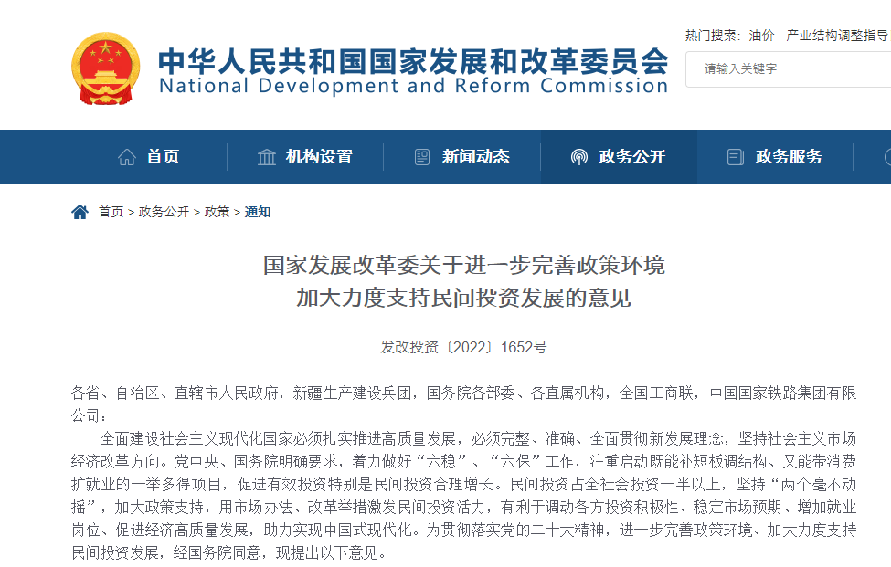 全面建設(shè)社會(huì)主義現(xiàn)代化國家必須扎實(shí)推進(jìn)高質(zhì)量發(fā)展,必須完整、準(zhǔn)確、全面貫徹新發(fā)展理念,堅(jiān)持社會(huì)主義市場(chǎng)經(jīng)濟(jì)改革方向。黨中央、國務(wù)院明確要求,著力做好“六穩(wěn)”、“六?!惫ぷ?,注重啟動(dòng)既能補(bǔ)短板調(diào)結(jié)構(gòu)、又能帶消費(fèi)擴(kuò)就業(yè)的一舉多得項(xiàng)目,促進(jìn)有效投資特別是民間投資合理增長。民間投資占全社會(huì)投資一半以上,堅(jiān)持“兩個(gè)毫不動(dòng)搖”,加大政策支持,用市場(chǎng)辦法、改革舉措激發(fā)民間投資活力,有利于調(diào)動(dòng)各方投資積極性、穩(wěn)定市場(chǎng)預(yù)期、增加就業(yè)崗位、促進(jìn)經(jīng)濟(jì)高質(zhì)量發(fā)展,助力實(shí)現(xiàn)中國式現(xiàn)代化。為貫徹落實(shí)黨的二十大精神,進(jìn)一步完善政策環(huán)境、加大力度支持民間投資發(fā)展,經(jīng)國務(wù)院同意,現(xiàn)提出以下意見。