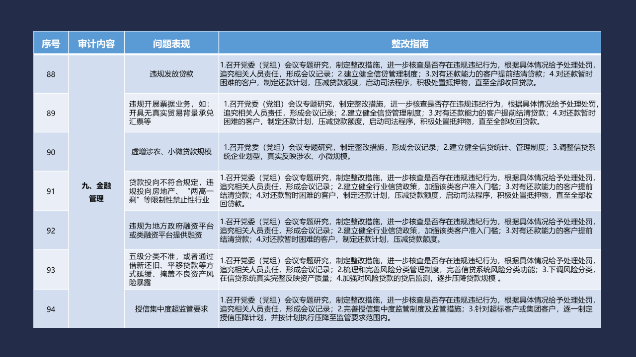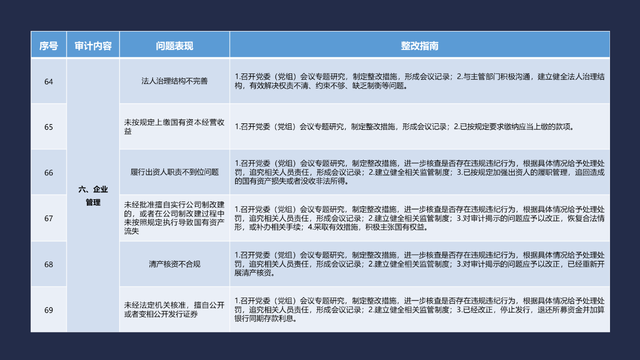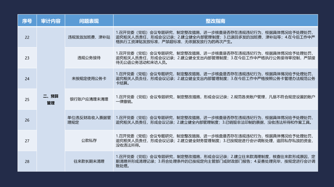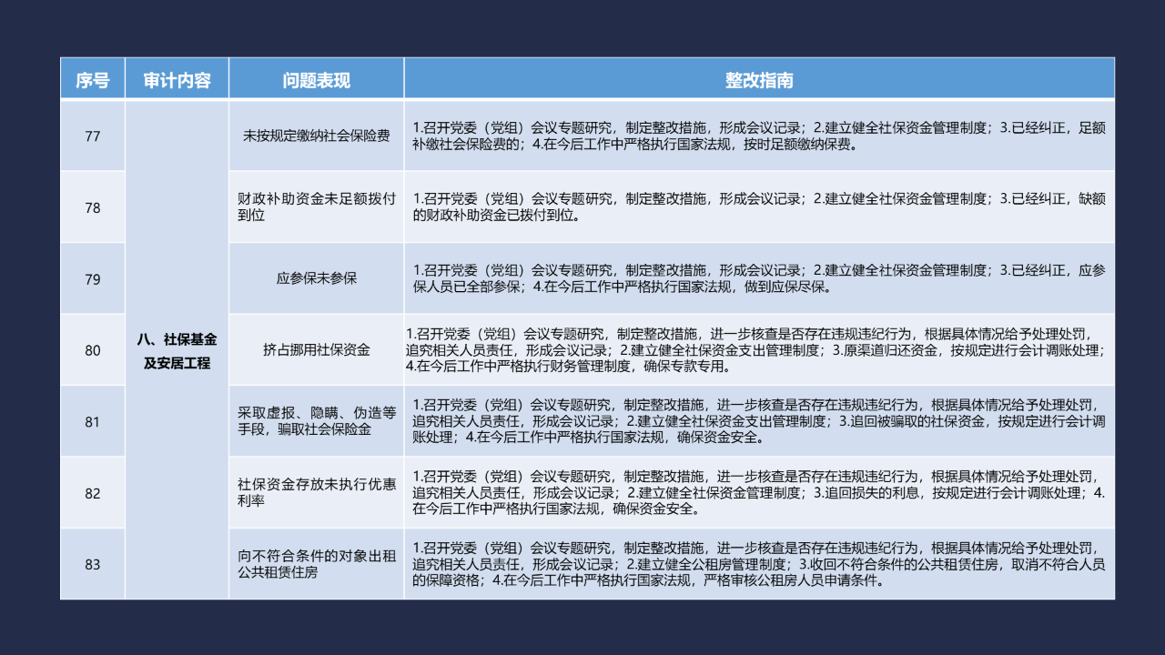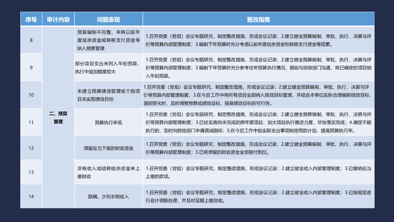 《整改指南100條》按照常見的重大政策措施落實、預算管理、政府采購及招投標、基本建設、內控管理、企業管理、自然資源、社保資金及安居工程、金融管理、國外貸援款共10類審計內容進行問題分類,列舉了100個常見問題并給出相對應的整改方法說明,供審計機關和整改責任單位在審計整改工作中參照落實。