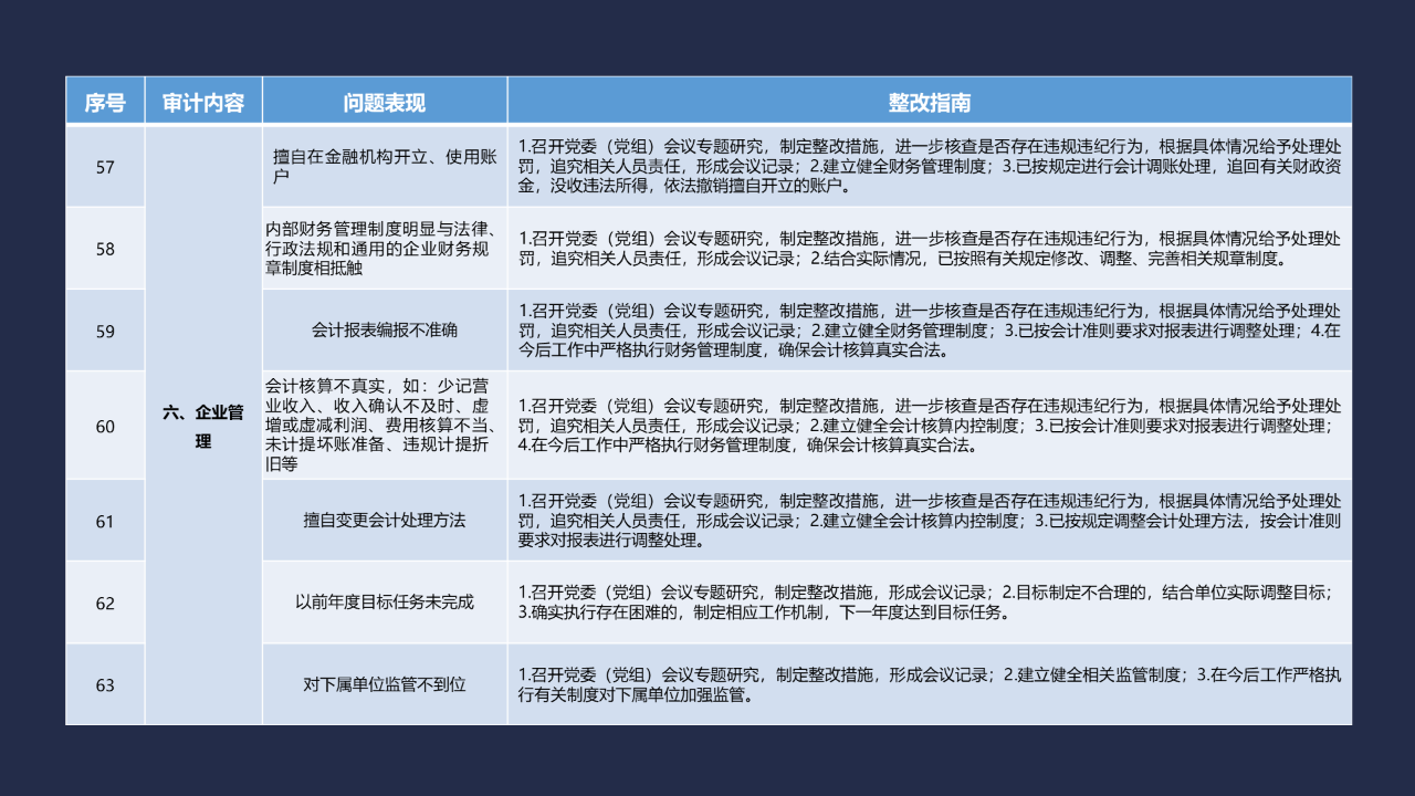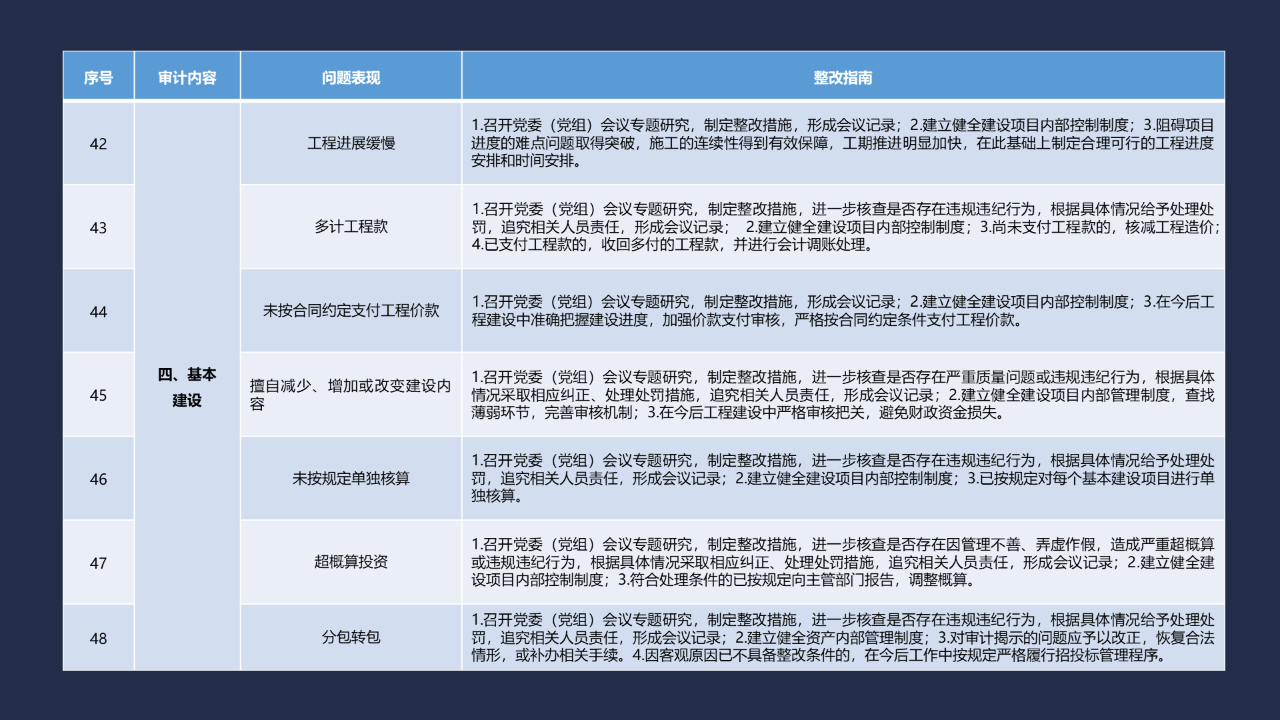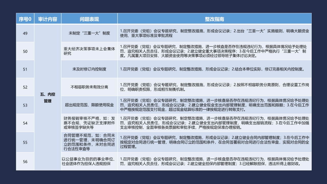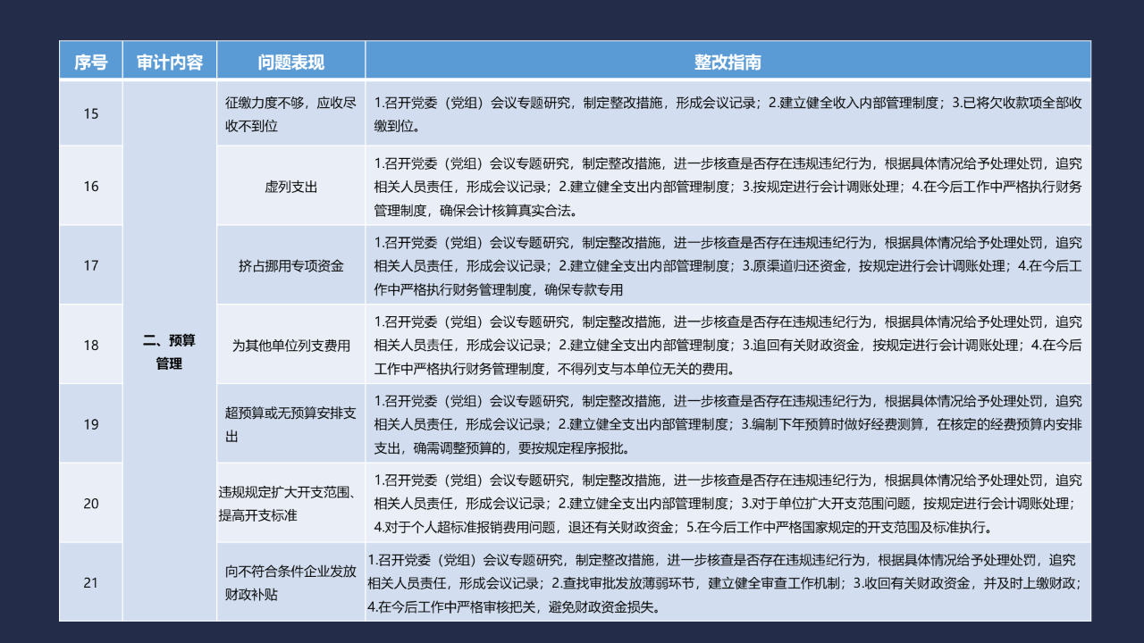 《整改指南100條》是在《江西省審計廳審計整改督查工作暫行辦法》(贛審綜發〔2021〕4號)第四章“審計整改認定標準”有關規定的基礎上,結合審計整改工作實際,對常見審計查出問題的整改結果認定標準進行明確和細化。《整改指南100條》按照常見的重大政策措施落實、預算管理、政府采購及招投標、基本建設、內控管理、企業管理、自然資源、社保資金及安居工程、金融管理、國外貸援款共10類審計內容進行問題分類,列舉了100個常見問題并給出相對應的整改標準說明,重點突出落實被審計單位整改主體責任、建立健全規章制度、推動問題全面整改等方面的內容,審計機關和整改責任單位可以在審計整改工作中參照落實。