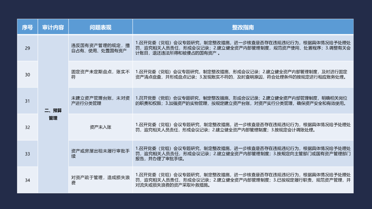《整改指南100條》僅對審計整改的認定提供一般參考,每個問題的具體整改要求由審計機關在此基礎上依據審計事實、問題情節、產生后果,在審計報告及所附的《審計發現問題清單》中予以明確。涉及上級審計查出問題的整改情況按照上級審計機關有關要求進行落實。