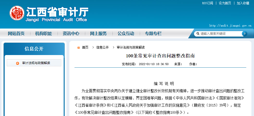 為進一步推動審計查出問題整改工作,加強對審計整改結(jié)果認定的指導,江西省審計廳印發(fā)了《100條常見審計查出問題整改指南》(以下簡稱《整改指南100條》)?!墩闹改?00條》按照常見的重大政策措施落實、預(yù)算管理、政府采購及招投標、基本建設(shè)、內(nèi)控管理、企業(yè)管理、自然資源、社保資金及安居工程、金融管理、國外貸援款共10類審計內(nèi)容進行問題分類,列舉了100個常見問題并給出相對應(yīng)的整改方法說明,供審計機關(guān)和整改責任單位在審計整改工作中參照落實。整改特色亮點一是突出落實被審計單位整改主體責任;二是突出健全完善長效機制;三是突出問題分類整改。