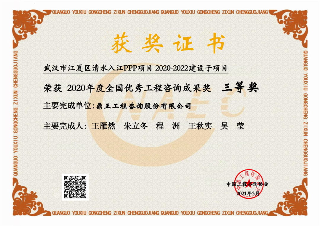 每兩年評選一次,2018-2019年,我司大悟縣宣化店旅游名鎮建設PPP項目首獲“全國優秀工程咨詢成果獎”榮譽;2020-2021年,我司武漢市江夏區清水入江PPP項目再獲該獎;2022-2023年,我司東數西算貴安新區算力立業集群配套項目第三次獲得此殊榮。