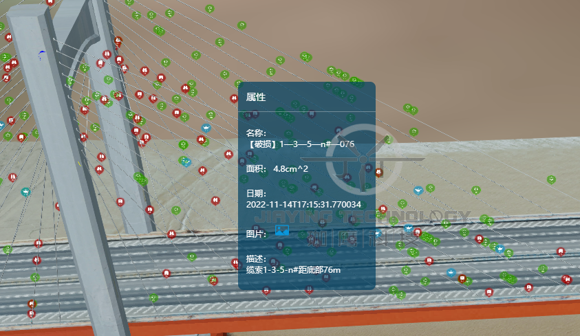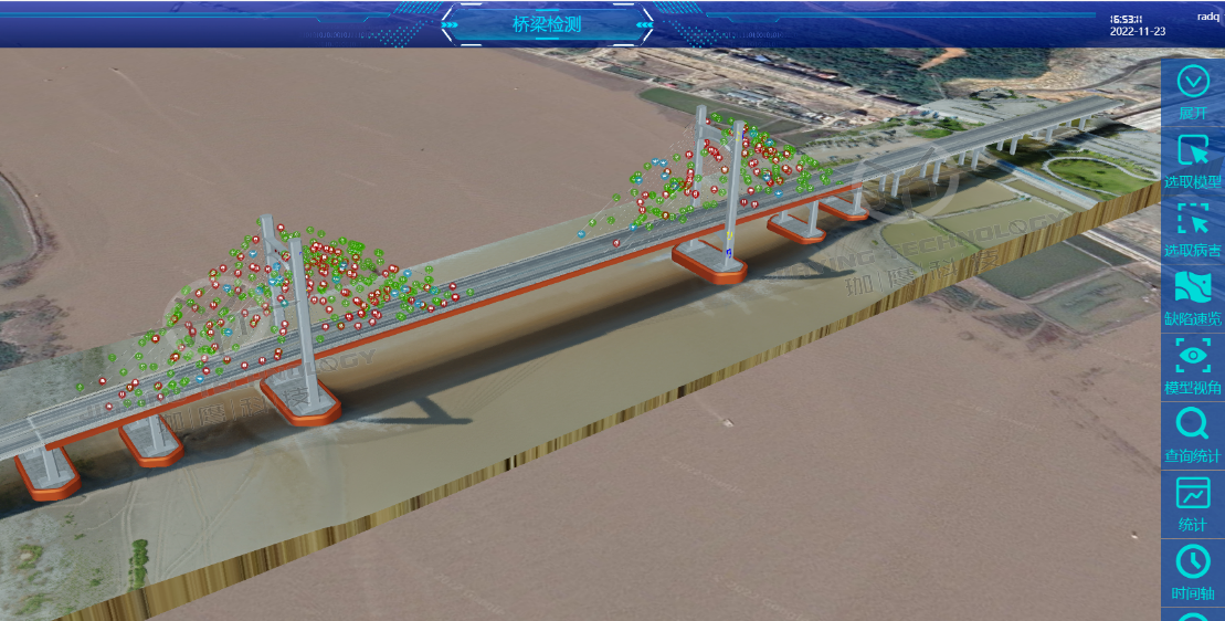 根據(jù)拍攝的高清圖像重建橋梁三維模型,并定量標示各類缺陷的位置,并且搭建獨立的大數(shù)據(jù)云平臺,實現(xiàn)橋梁缺陷與病害的可視化,對橋梁問題進行三維立體化復現(xiàn),為橋梁安全運行提供數(shù)據(jù)支撐。