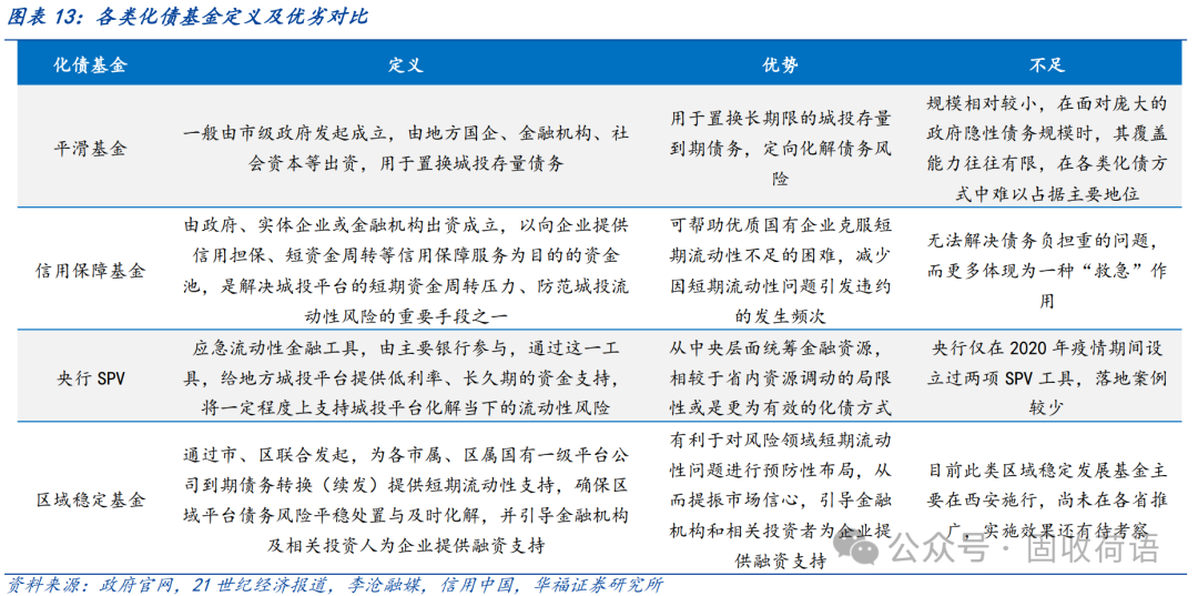 設立“化債基金”作為地方政府有效的管控城投債務風險的手段,被各地廣泛運用,包括平滑基金、信用保障基金、央行SPV等。基金資金主要來源于省內(nèi)/市內(nèi),調(diào)動的是區(qū)域內(nèi)的金融資源,但規(guī)模相對有限;SPV在投放貸款的同時或要求抵押品,因此國有資源更為豐富的區(qū)域預計將獲得更大的支持。