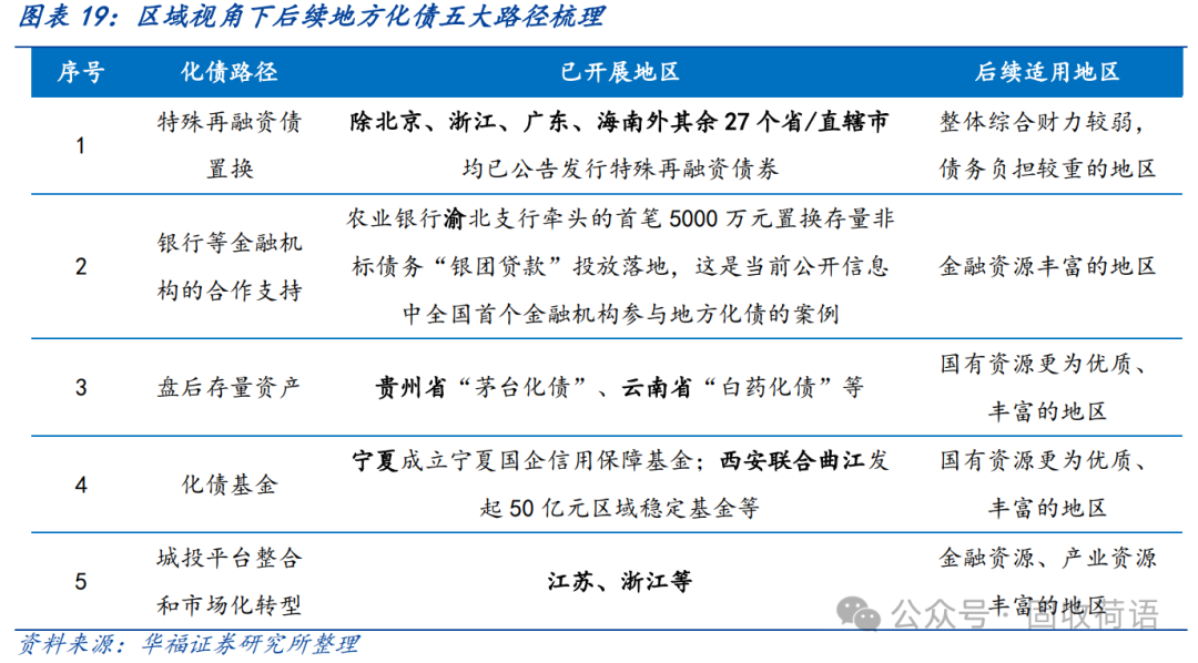 財政部《地方全口徑債務清查統(tǒng)計填報說明》中提出六種常見的債務化解舉措,具體為(1)安排財政資金償還;(2)出讓政府股權以及經(jīng)營性國有資產(chǎn)權益償還;(3)利用項目結轉資金、經(jīng)營收入償還;(4)合規(guī)轉化為企業(yè)經(jīng)營性債務;(5)通過借新還舊、展期等方式償還;(6)采取破產(chǎn)重整或清算方式化解。同時,根據(jù)各地化債動態(tài)表述,各地根據(jù)自身情況,積極探索了金融機構貸款置換、城投平臺整合或轉型、特殊再融資債置換、設立化債基金等方式推動化債進程。