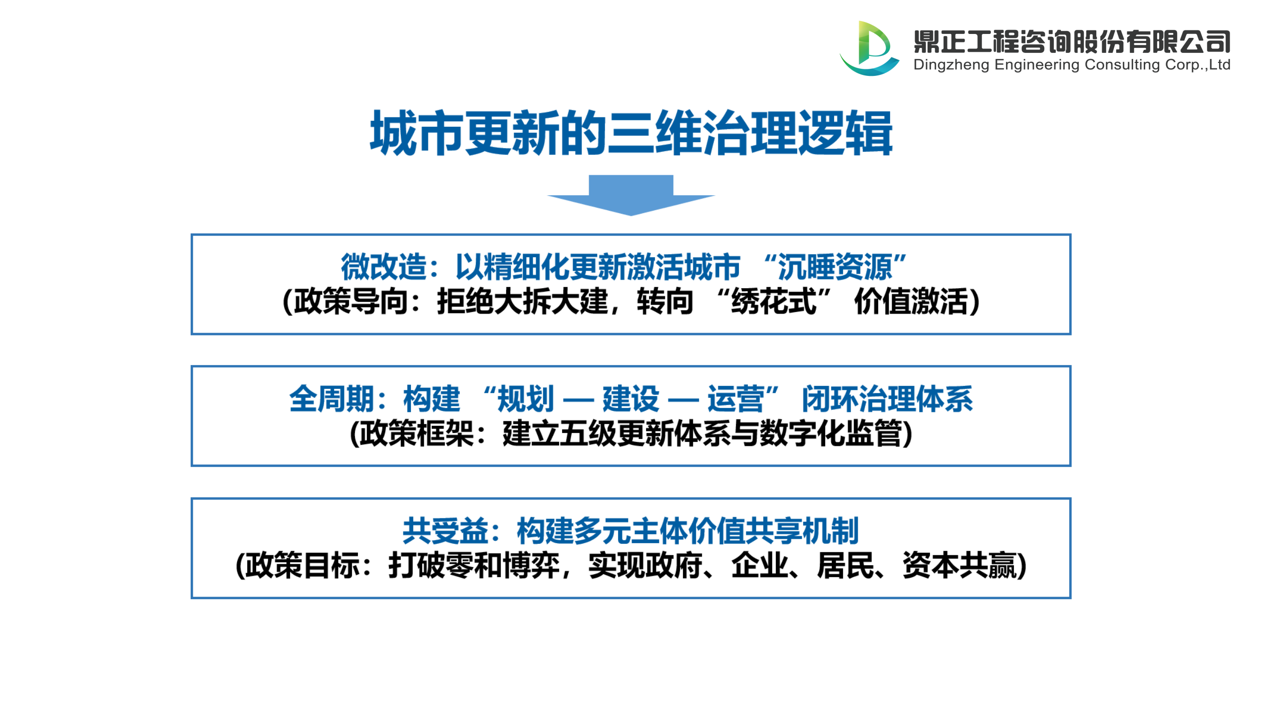 (二)全周期:閉環(huán)治理體系 《意見(jiàn)》提出構(gòu)建“房子—小區(qū)—社區(qū)—城區(qū)—城市”全鏈條更新體系,并通過(guò)“城市體檢—規(guī)劃引領(lǐng)—?jiǎng)討B(tài)監(jiān)管—長(zhǎng)效運(yùn)營(yíng)”機(jī)制確保系統(tǒng)性推進(jìn)。