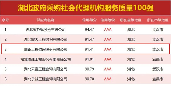 鼎正印記丨名列三甲 榮登湖北政府采購社會代理機構(gòu)服務(wù)質(zhì)量百強榜